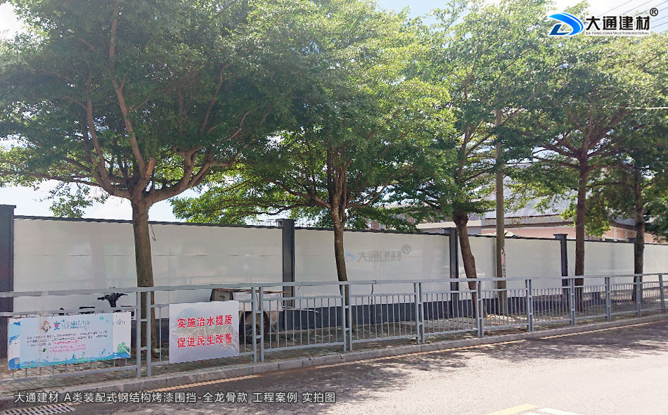 深圳市大通建材裝配式鋼圍擋全龍骨A款 采用裝配式+鋼結構+全龍骨 烤漆鋼板構造 安全穩固 抗風力強 美觀環保 經久耐用,應用于廣東省深圳市大鵬新區楊梅坑改造項目工程中,以下展示的圍擋圖片是大通建材裝配式鋼圍擋全龍骨A款在該項目部分位置的實拍圖