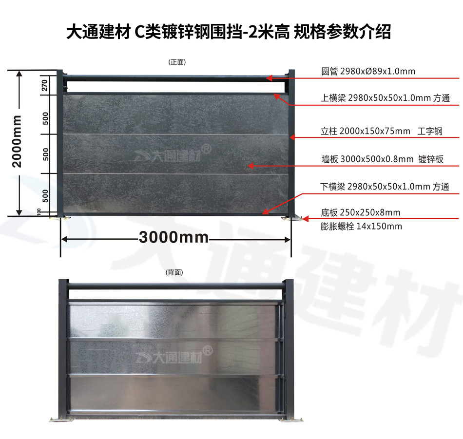 深圳大通建材C類裝配式鋼圍擋-鍍鋅板款通常作為圍墻護欄使用,起隔離防護作用。常規一擋的長度是3米、高度是2.4米和2.5米,若沒有特殊要求的項目工程按性價比來選擇鍍鋅鋼板圍擋款式建議是選擇鍍鋅鋼板圍擋c款的2.4米高的工字鋼立柱的普通款。如果對高度要求至少要2.5米高的工程,這種情況下建議使用H型鋼立柱鍍鋅鋼板圍擋c