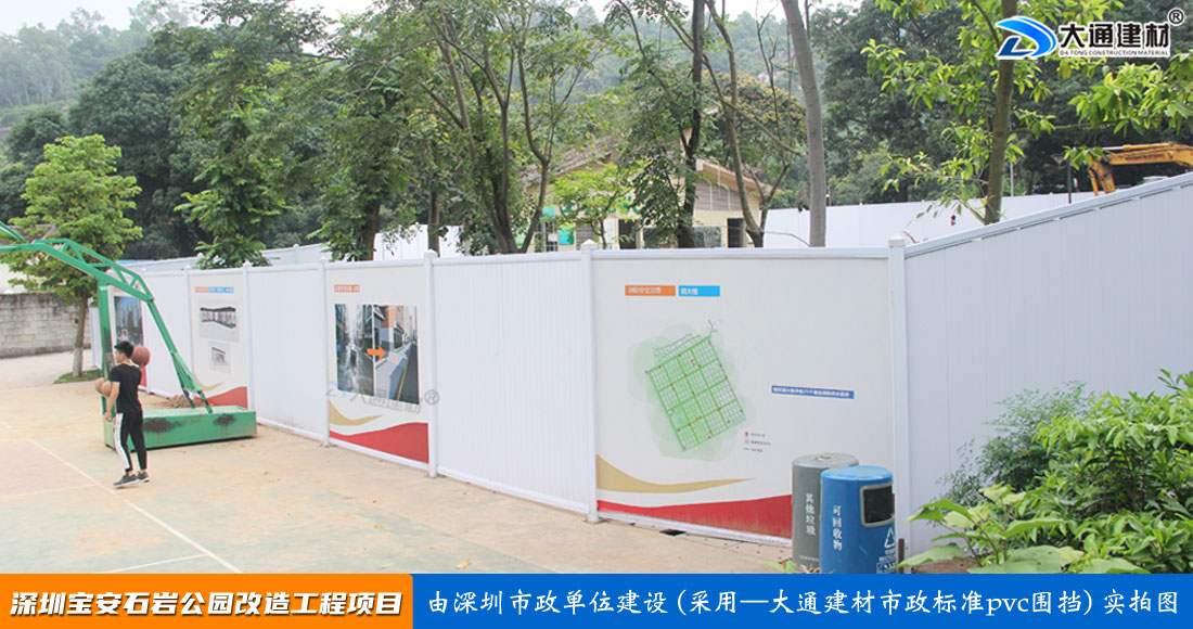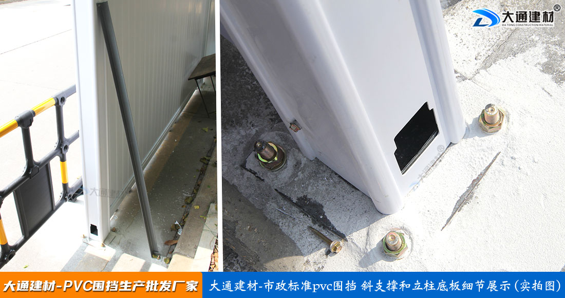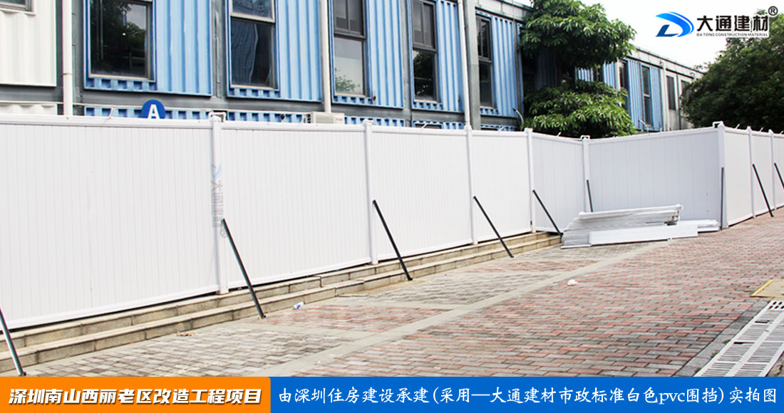 深圳市大通建材生產(chǎn)批發(fā)的市政標(biāo)準(zhǔn)PVC圍擋的圍擋墻板采用PVC長條版拼接,立柱、橫管均為PVC材料,內(nèi)部均襯方通。立柱底板為鋼板,并加斜撐受力,來保證PVC圍擋抗風(fēng)力更強、更安全穩(wěn)固。大通建材常規(guī)款PVC圍擋尺寸長3mx高2.5m、長3mx高2.2m、長3mx高2m 其它PVC圍擋尺寸可按實際需要進行定制生產(chǎn)。